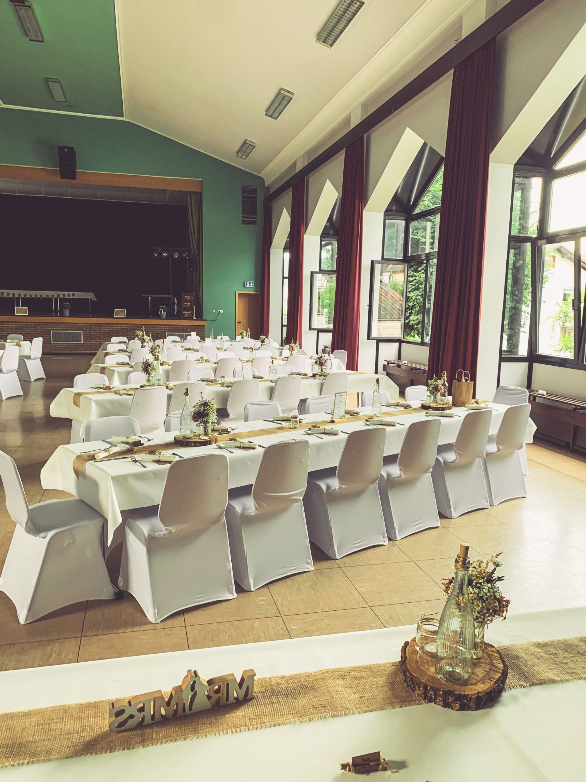 Ob Stadthalle, Bürgerhaus oder Turnhalle: Viele Abiball-Locations haben unterschiedliche Stuhlmodelle – oft Holzstühle, Stapelstühle oder ältere Bestuhlung. Das wirkt schnell unruhig und „zusammengewürfelt“. Mit hochwertigen Stuhlbezügen für den Abiball schaffst du in wenigen Minuten ein einheitliches, elegantes Gesamtbild – und der Raum wirkt sofort wie eine festliche Gala-Location.